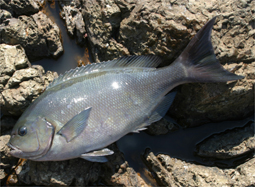 生息域/沿岸の岩礁帯に棲み、幼魚期は波止周りでも生息する。 習性等/正式和名はメジナ、関西はグレ、九州ではクロと呼ぶ。 根周りを好む口太(メジナ)と本流を好む尾長(クロメ ジナ)に分かれる。釣り味はダイナミック。特に良型以 上は最後のツッコミをかわせるかどうかで勝敗が決まる。 釣り方/>>船掛かり釣り